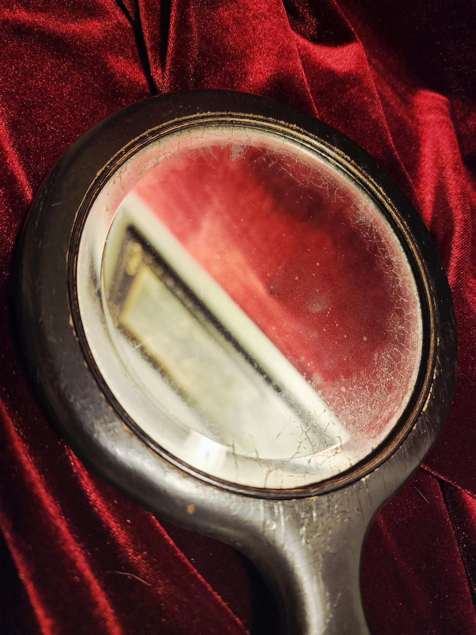 Elegant, black wooden hand mirror with beveled glass from the 1920's. This particular mirror is likely a hand mirror for shaving.