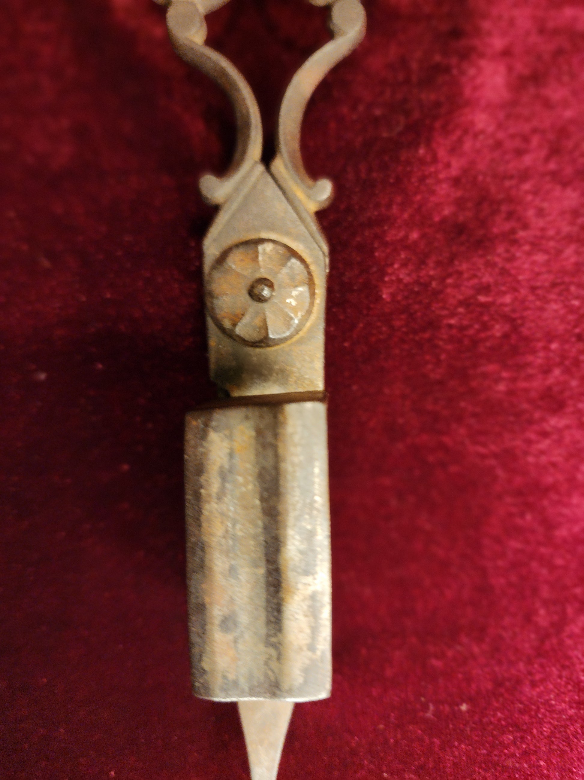 This tool was used to trim the burnt wick of a candle and to extinguish the flame. The box on one side of the blade is to catch the clipped wick.