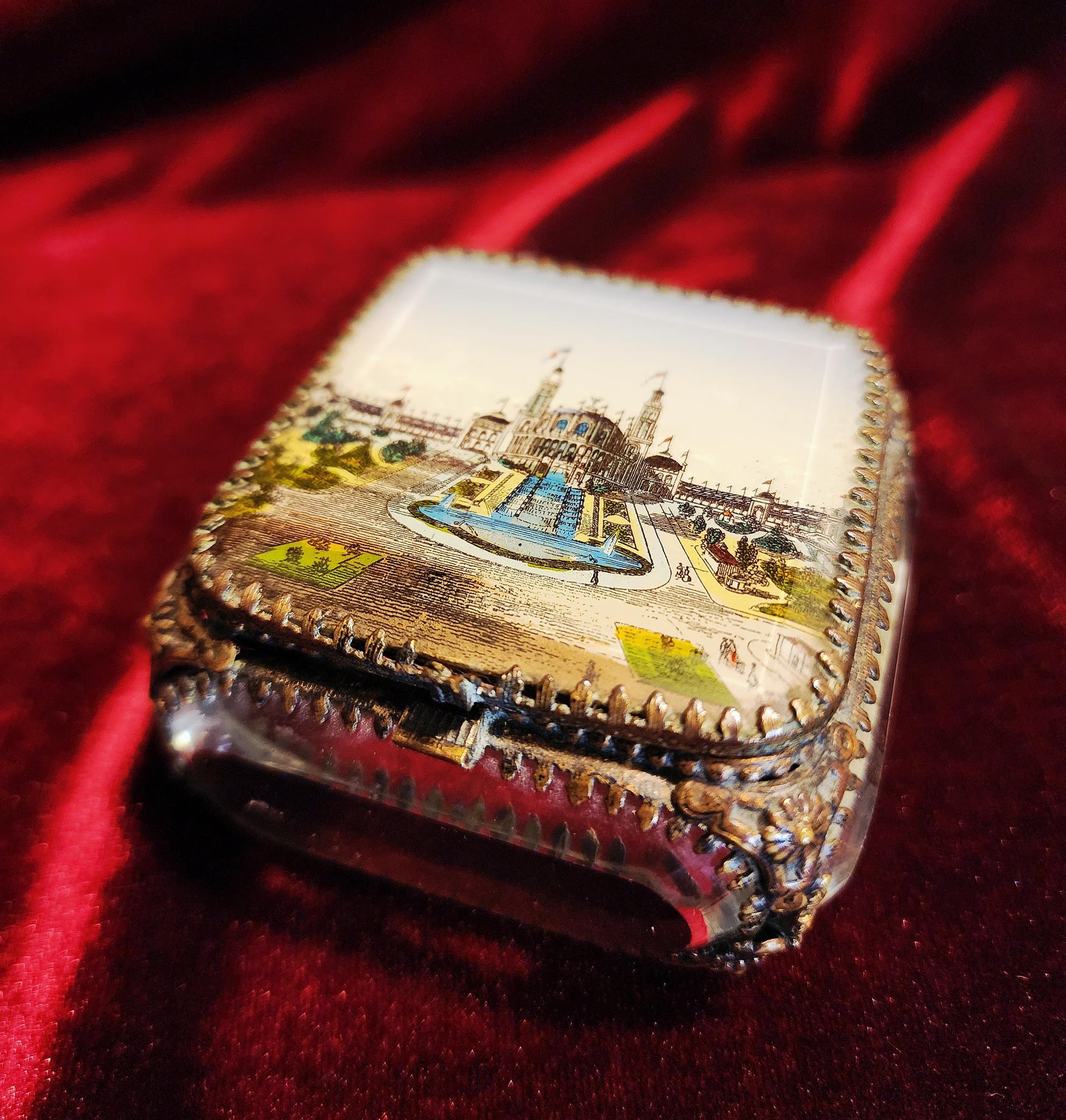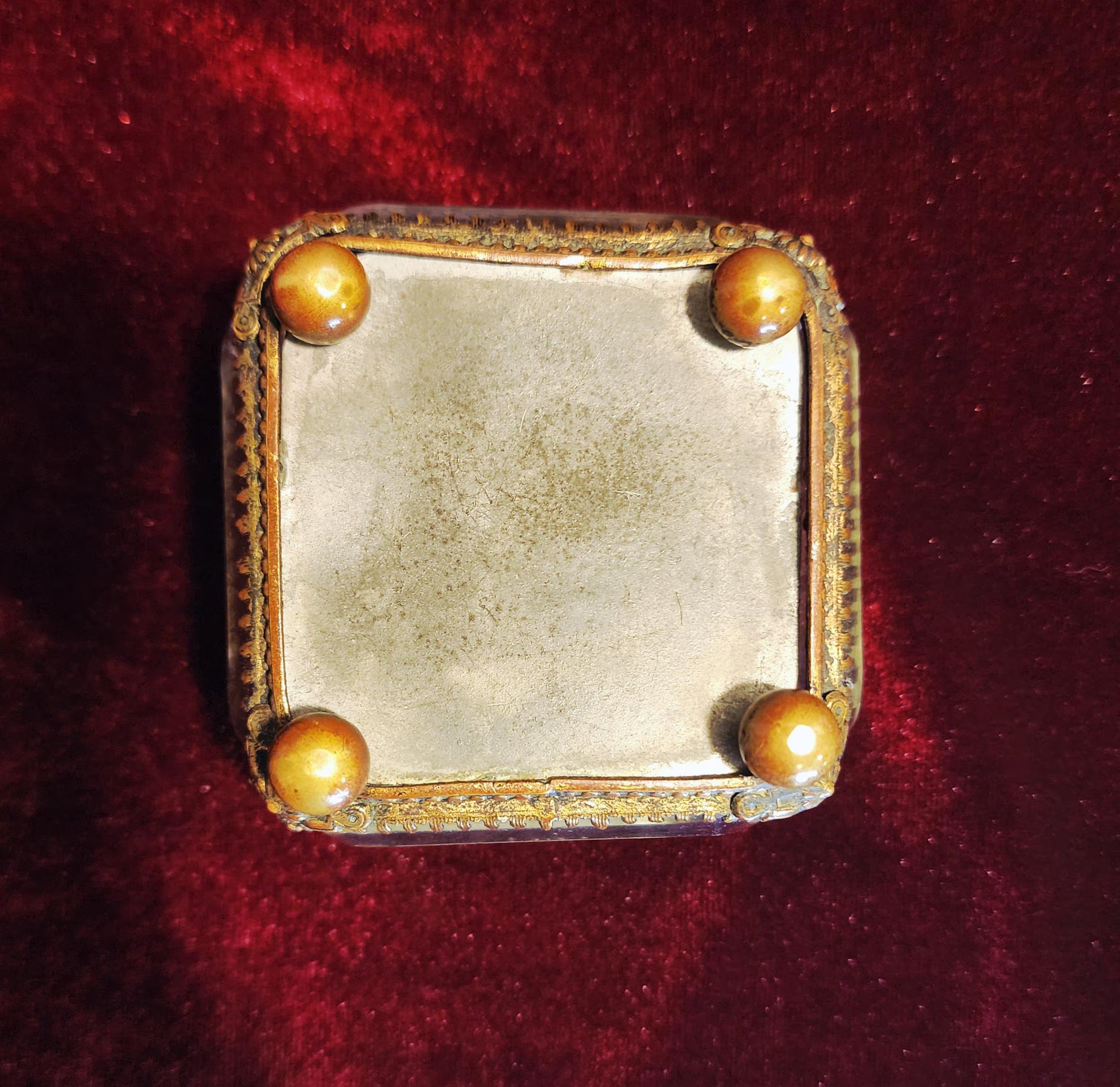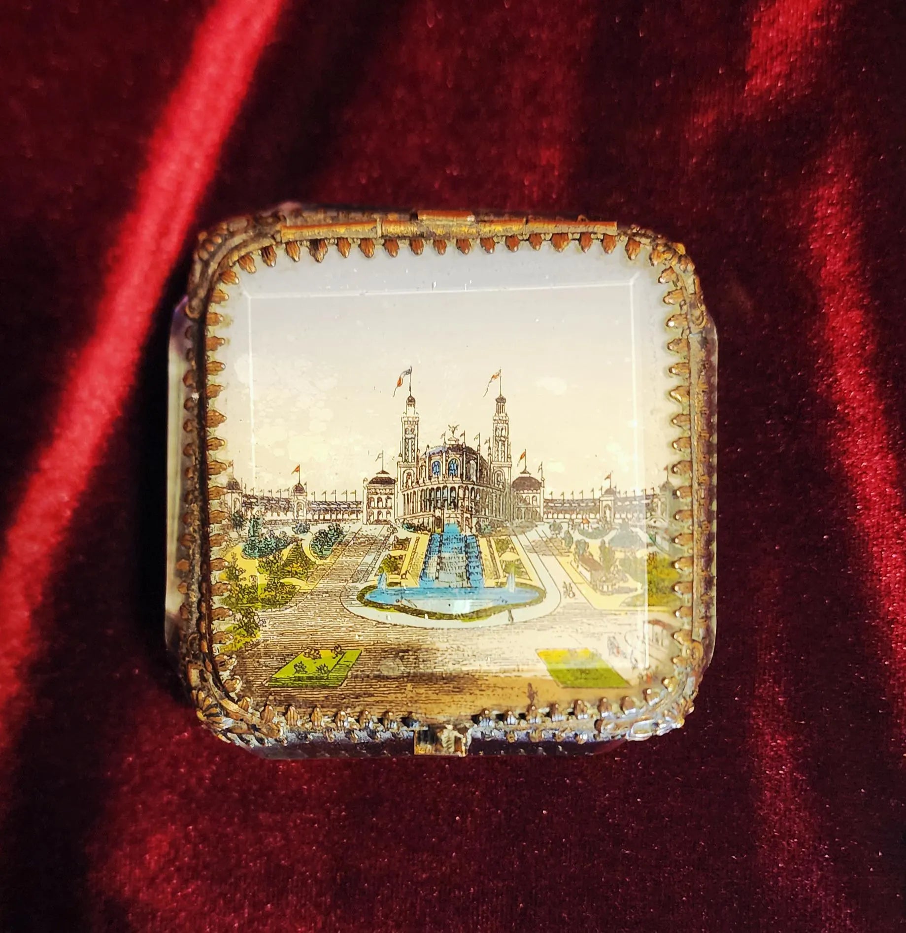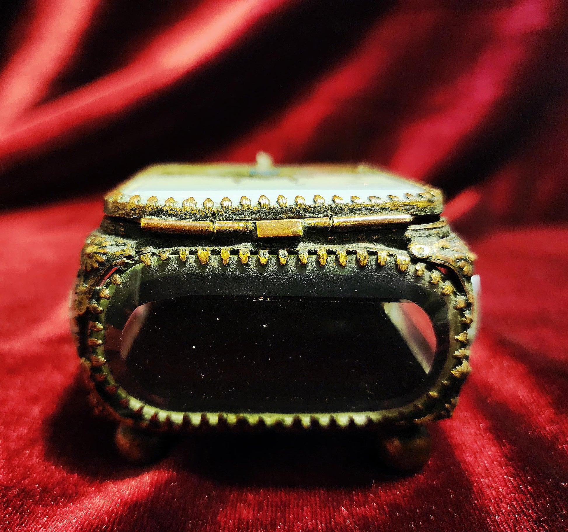This antique, French trinket box has 4 sides of beveled glass, held in place by brass teeth. The body of this jewelry box has ornate corners and feet that keep this piece solid. Inside on the base is a black padded cushion with the lid having a dark red cushion. Possibly dated around 1904, these boxes were a souvenir for those visiting Paris, France.