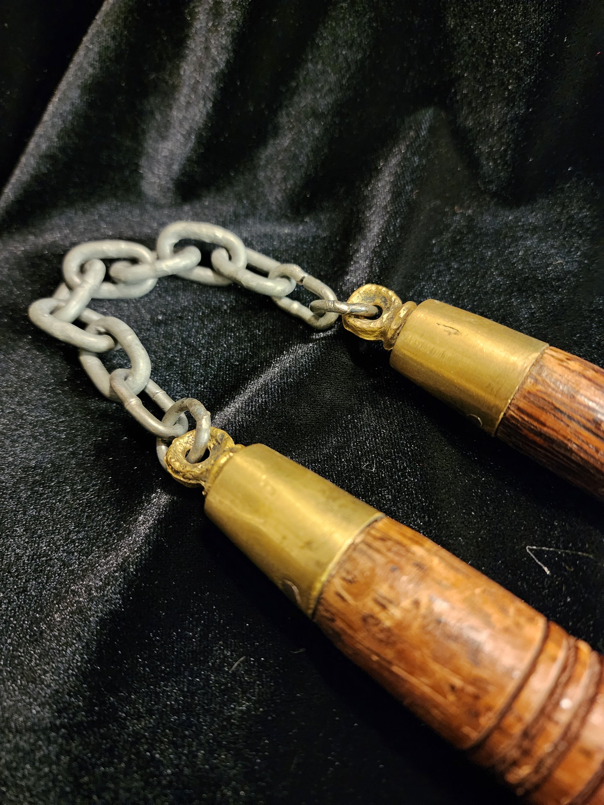 Authentic wooden nunchucks used as a martial arts weapon consisting of two sticks joined by a short rope or chain. They were originally a farming tool for threshing grain before being adapted for self-defense and widely popularized by Bruce Lee in the 1960's.