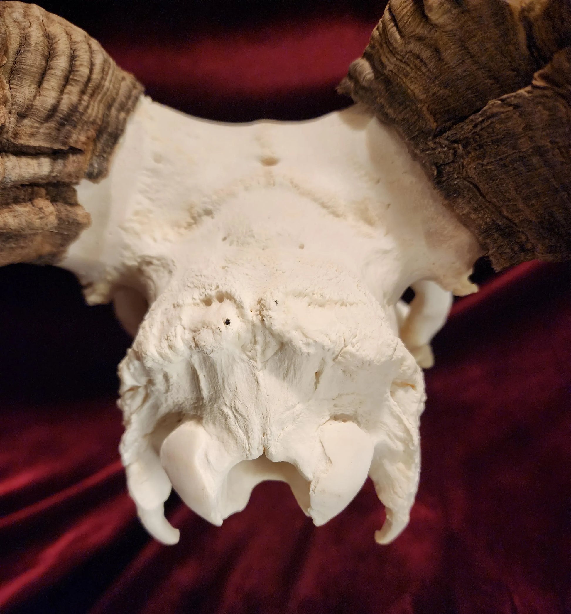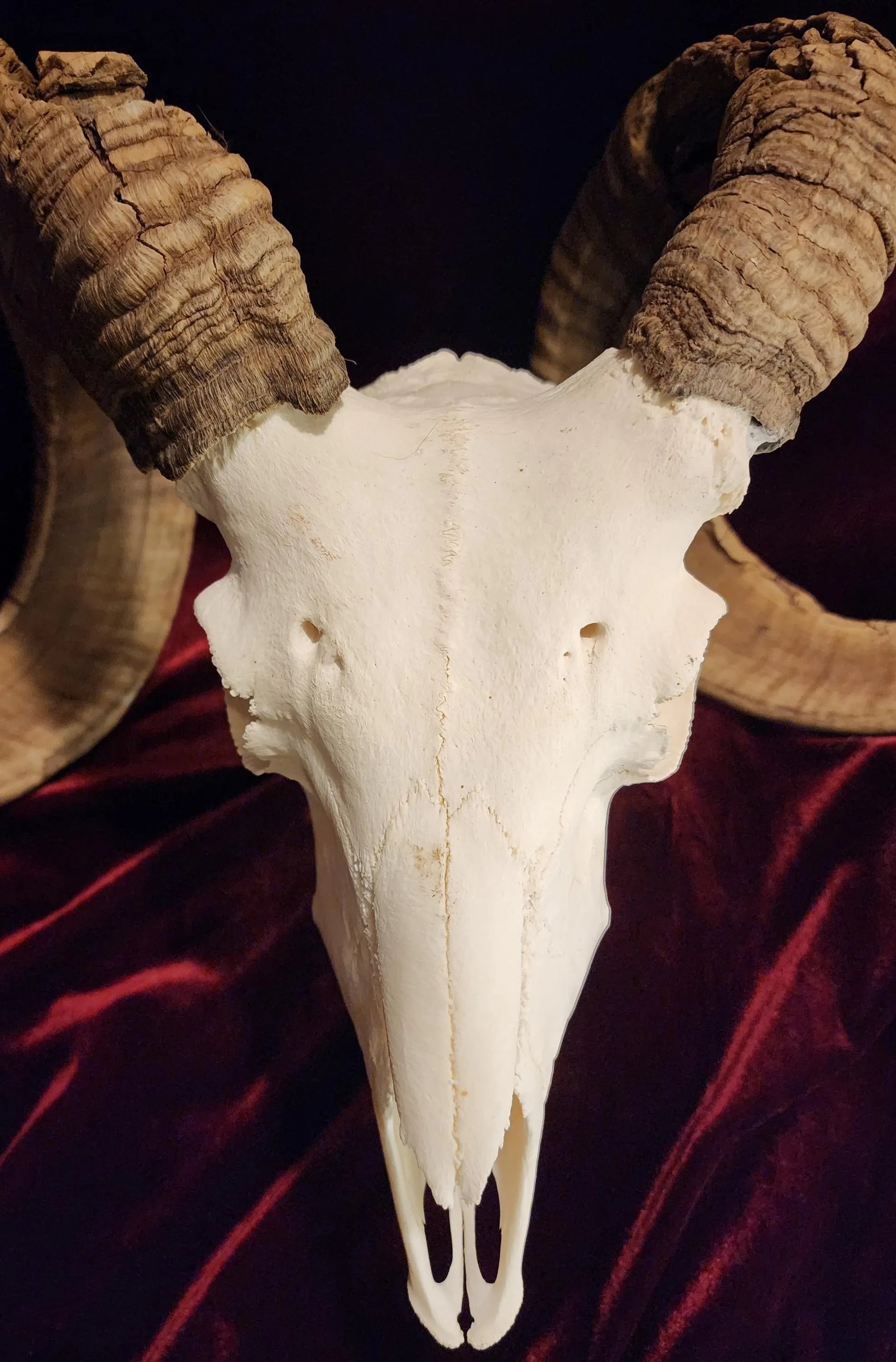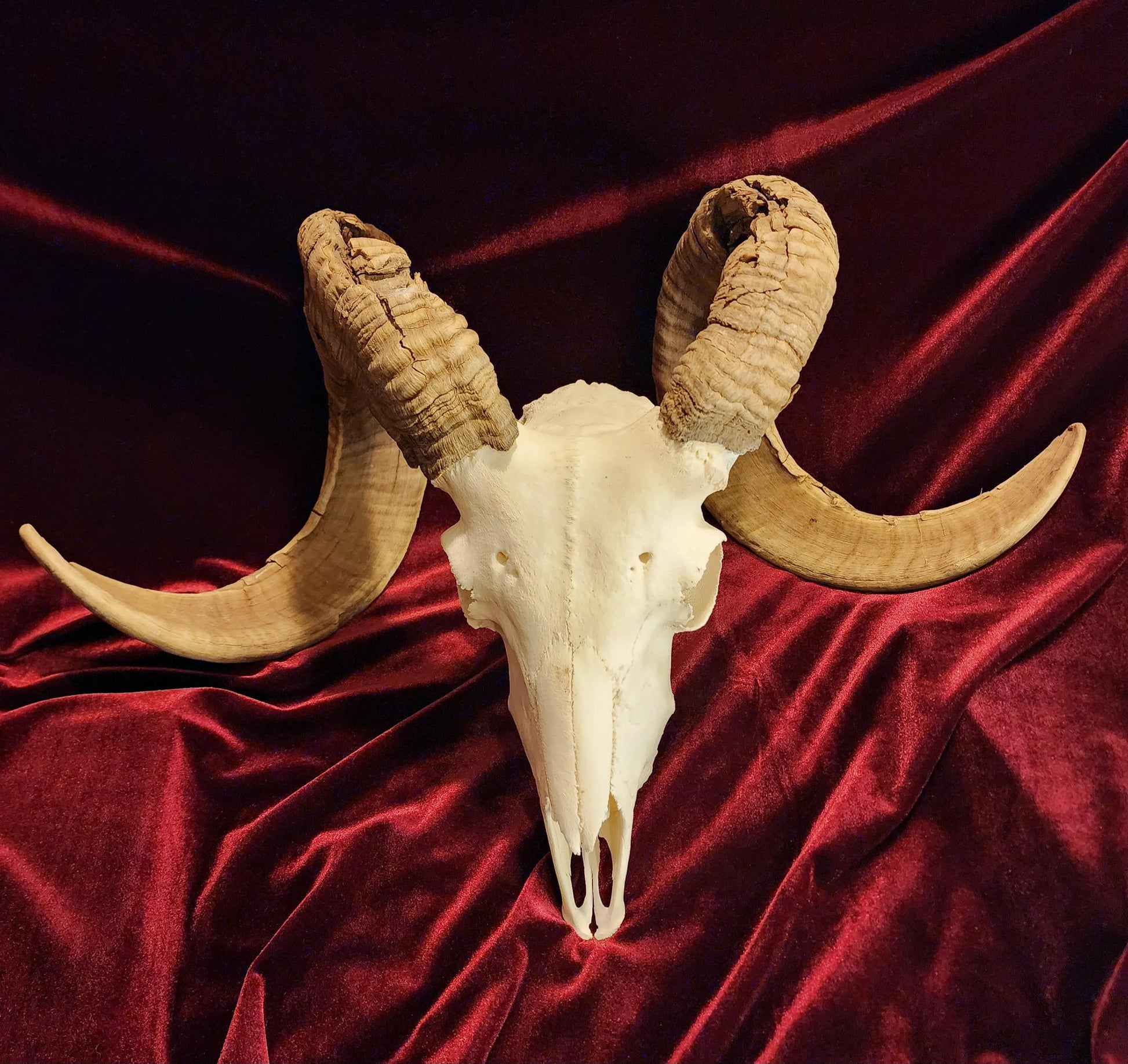 Authentic ram skull. These horns are incredible. The flaws you see happened throughout this rams life. We here at Blackhollow Fever process many of our bones and skulls right here within our home and brick and mortar. The long process makes it worthwhile. The end result is a beautiful, clean, and white skull.