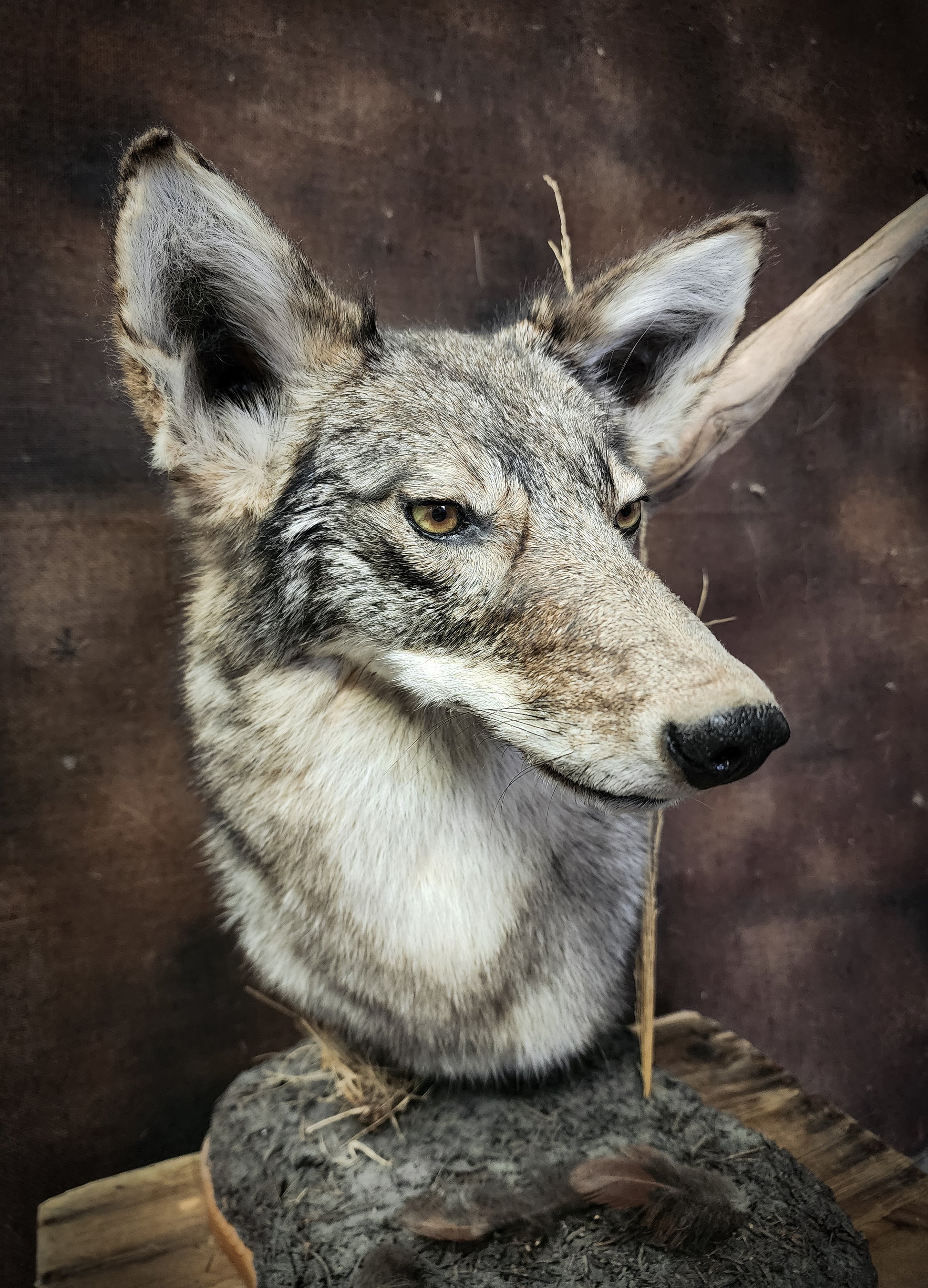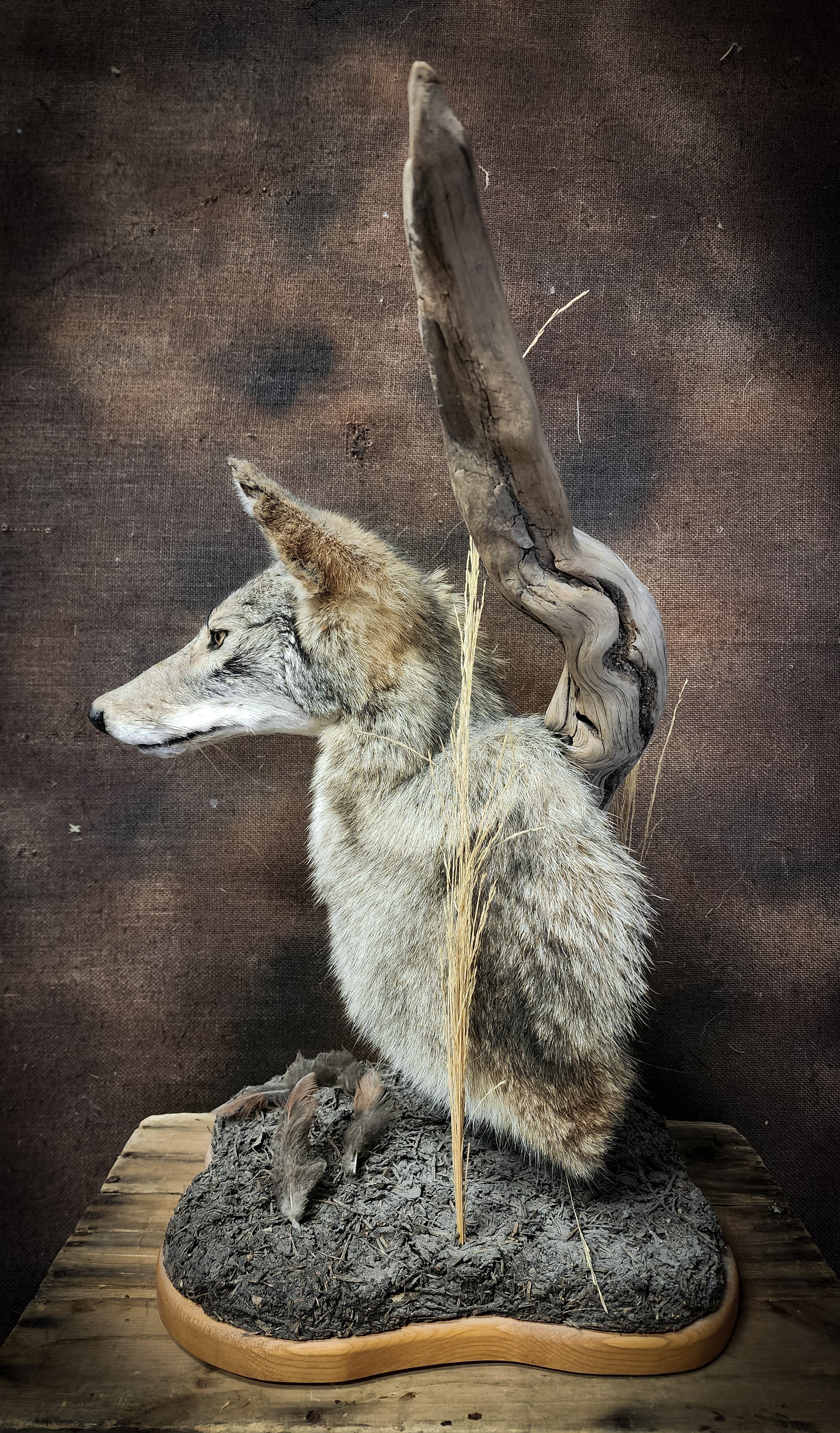 An excellently preserved taxidermy coyote shoulder mount on driftwood, pine needles, and feathers amongst the base. Do his squinting eyes read "smug" or "determined"?