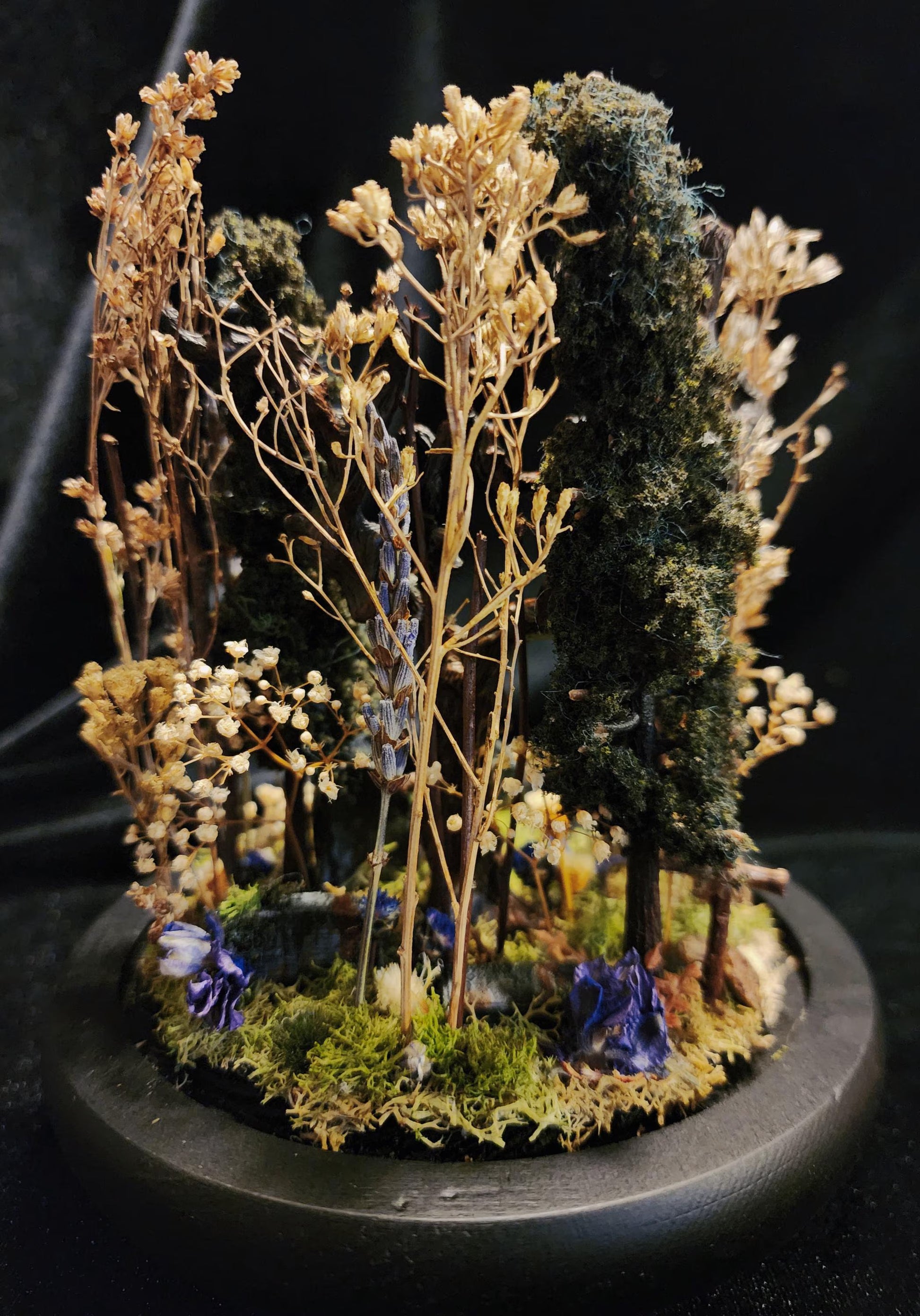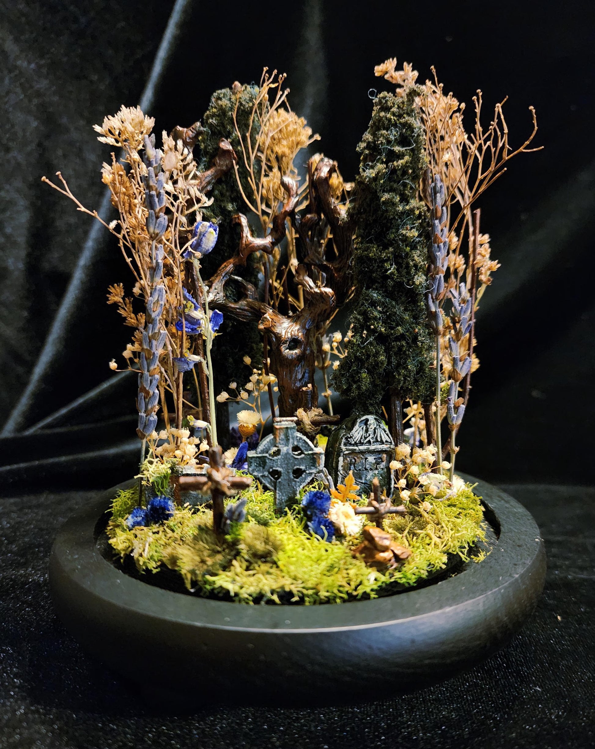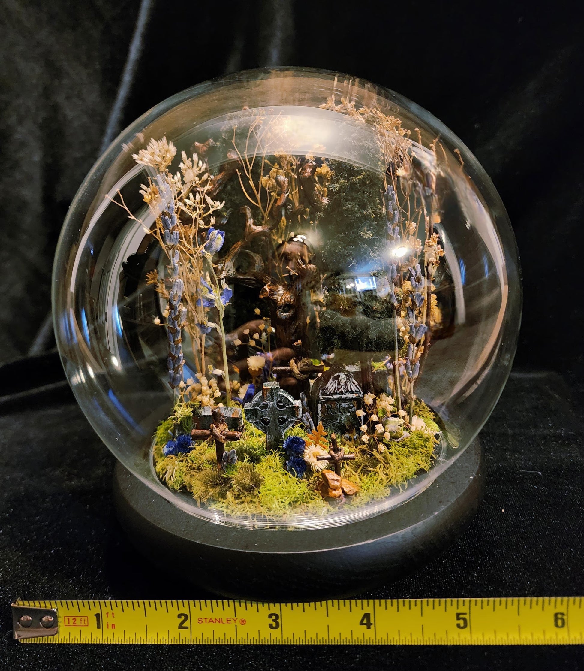 Miniature cemetery scene in glass dome with multiple hand painted clay headstones. It's never too late or too early to begin your spooky collection.
