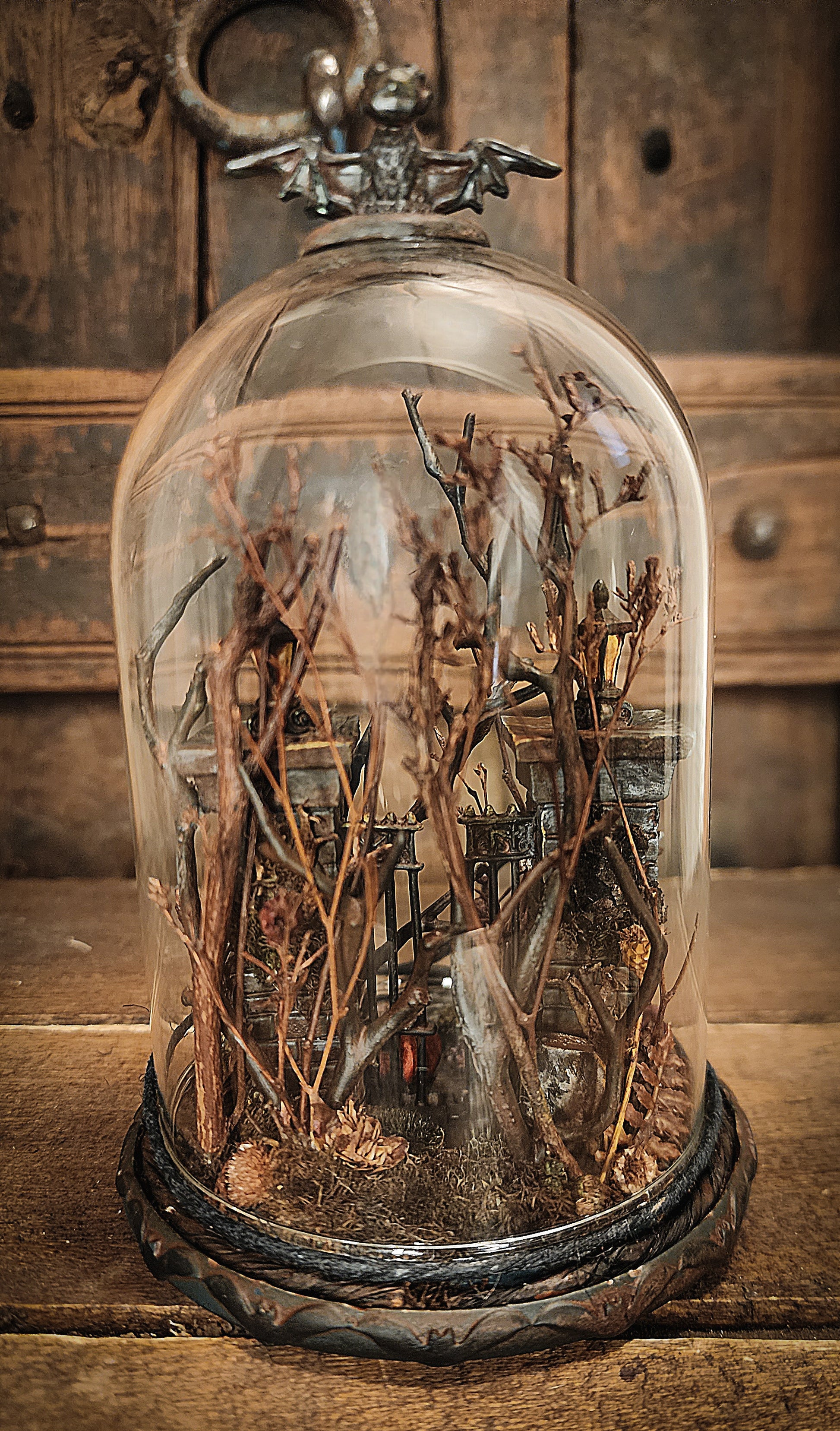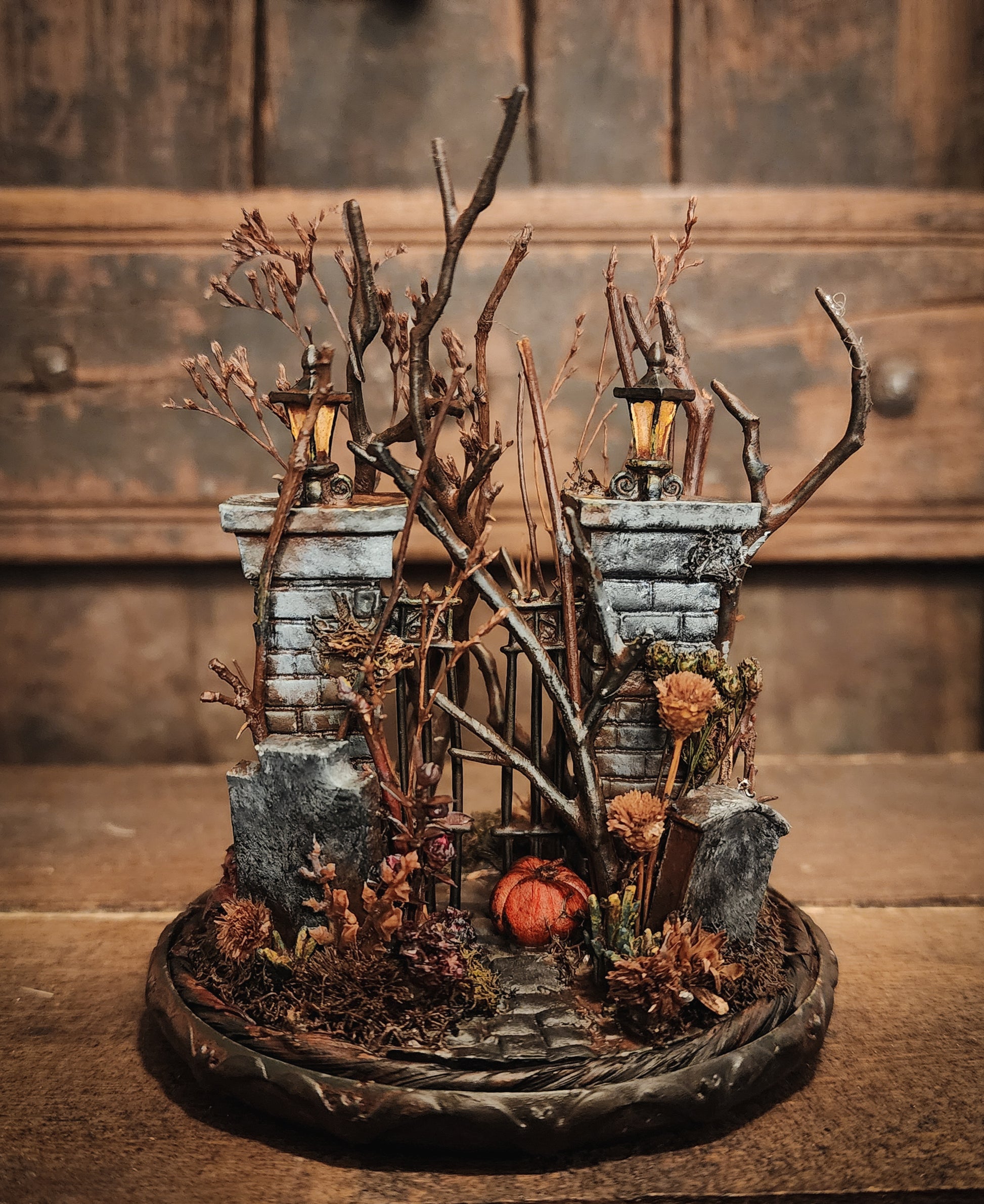 Miniature Cemetery in glass dome with a three hand painted headstones and stone walled cemetery gates. It's never too late or too early to begin your spooky collection.