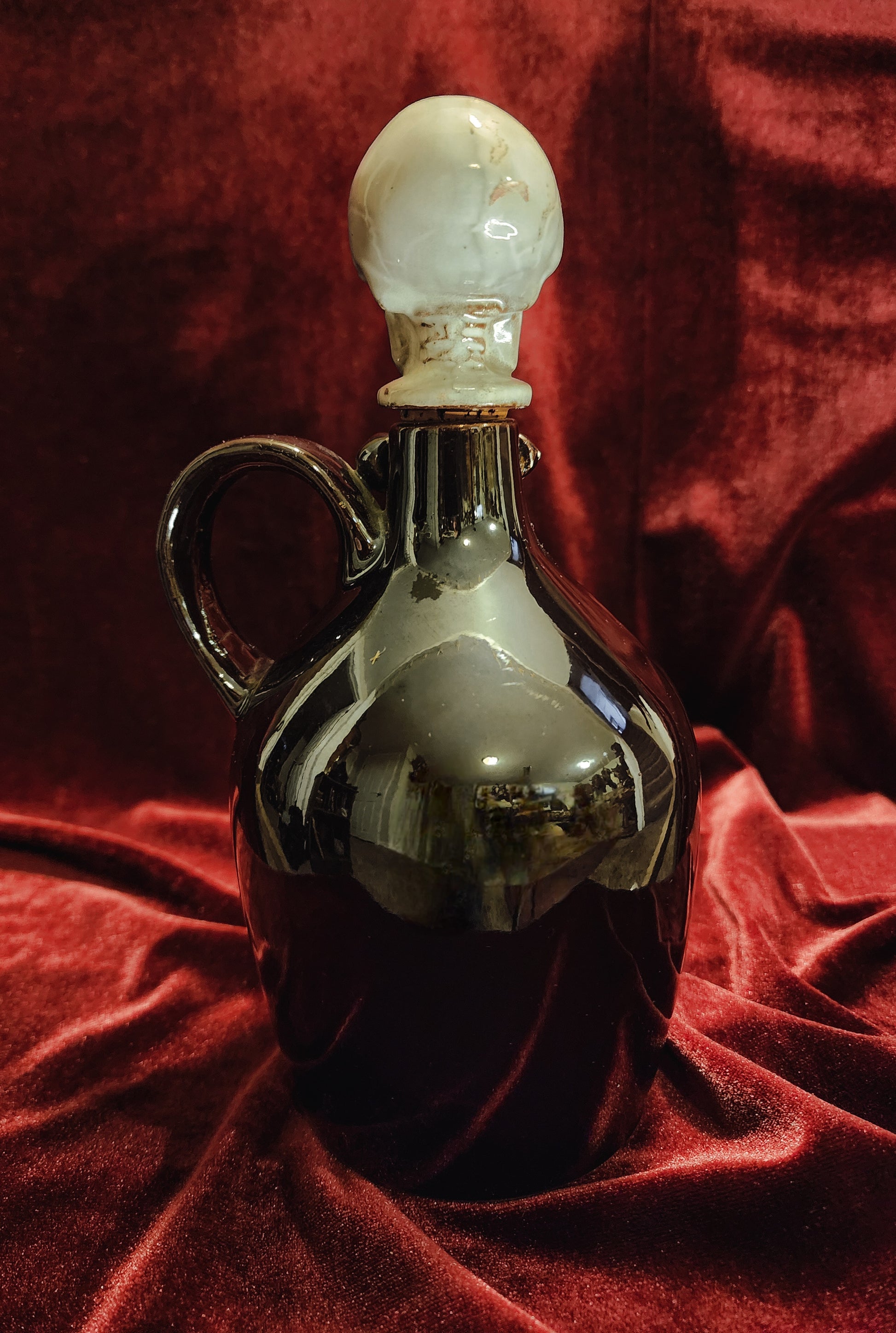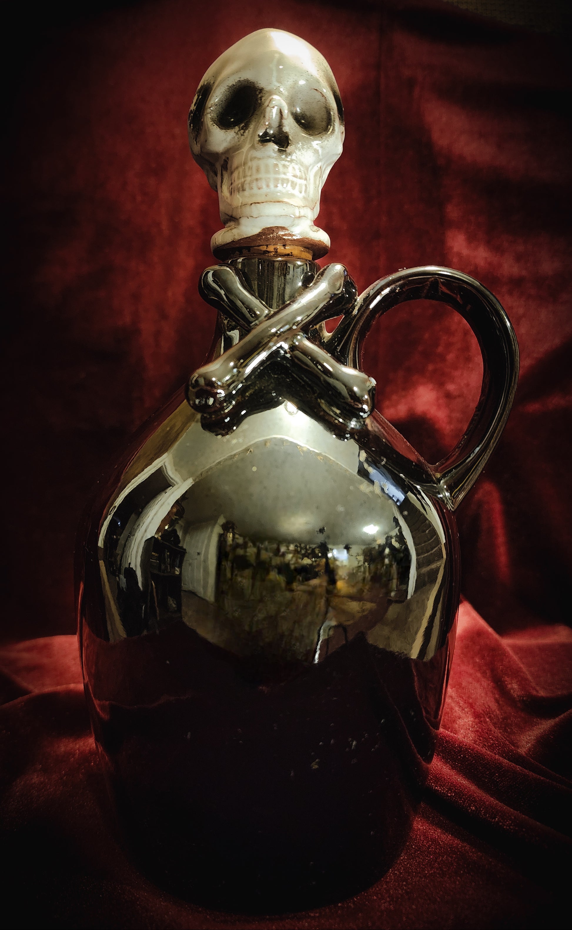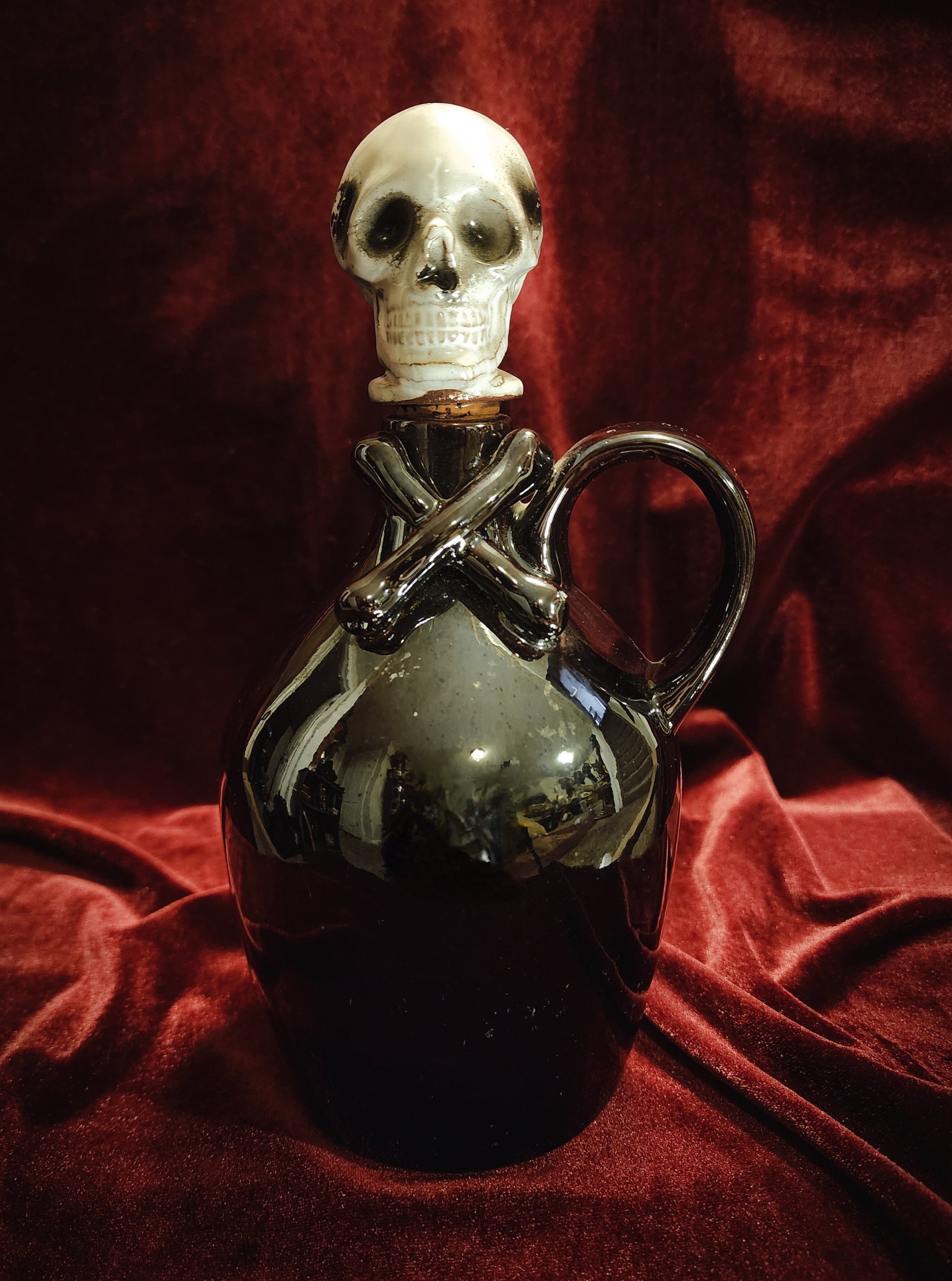 Vintage 1940's-1950's deep brown ceramic skull stopper and crossbones decanter.